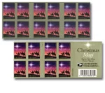 The stamp celebrates the biblical story of three visitors from the east who came bearing gifts for Jesus. The stamp art depicts the Magi atop camels near the summit of a small hill. Guiding them is a large, dazzling star.
